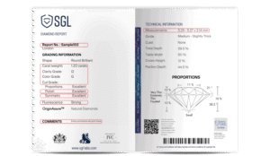 The SGL Diamond Certificate is a trusted and credible diamond certification in India. It has all the information about the diamond right from its origin to its proportions and symmetry is included in that. For presenting a reliable report to its customers, SGL Labs grades diamonds on the basis of an internationally recognised diamond grading system and discloses the tiniest information to ensure transparency.